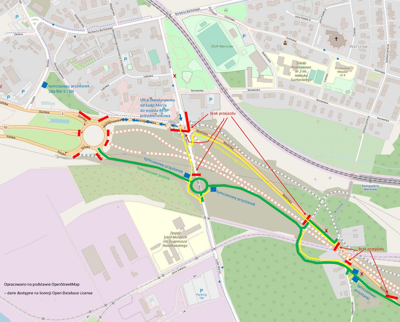 Wykonawca budowy drogi ekspresowej S3 zawiadomił, że od godz. 10:00 dnia 12 maja 2023 r. wprowadzi czasowe zmiany organizacji ruchu na ulicy Wolińskiej i Ludzi Morza, które spowodują wyłączenie z obsługi będą przystanki: 1) „Wolińska-Odra” w pobliżu skrzyżowania z ulicą Wrzosową; 2) „Ludzi Morza/Łąkowa” – w kierunku ulicy Barlickiego i dworca autobusowego. W związku z powyższym przygotowane będą tymczasowe przystanki na tymczasowej jezdni w pobliżu ulicy Wrzosowej oraz w pobliżu ronda południowego przy ul. Ludzi Morza, a także jeden tymczasowy przystanek na ulicy Fińskiej w pobliżu marketu „Biedronka” w kierunku dworca autobusowego (dla linii 5 i 10).