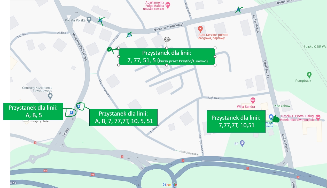 - linii: 7, 77, 51 jadące z Węzła Przesiadkowego w kierunku Dzielnicy Warszów mają wyznaczony przystanek zastępczy przy ul. Fińskiej na tymczasowym łączniku z ul. Barlickiego,